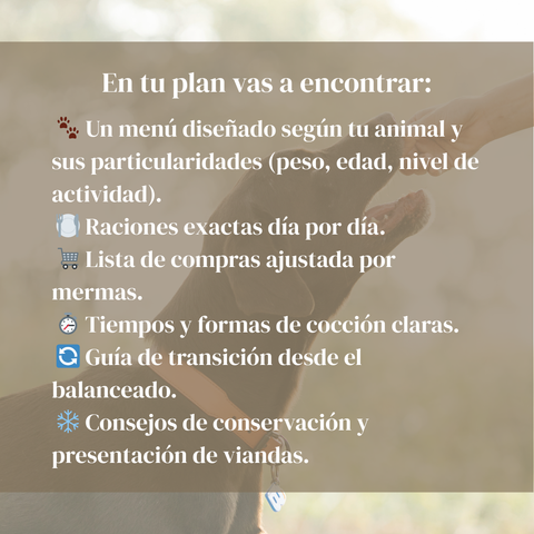 No es un plan genérico: es un plan diseñado especialmente para tu animalito, teniendo en cuenta sus características particulares y con seguimiento directo para que puedas sentirte acompañado en cada paso.