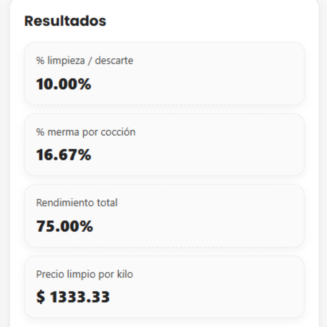 Ingresás lo comprado, peso limpio y cocido, y el total pagado. La calculadora devuelve % de limpieza, % de merma, rendimiento y costo real por kilo.