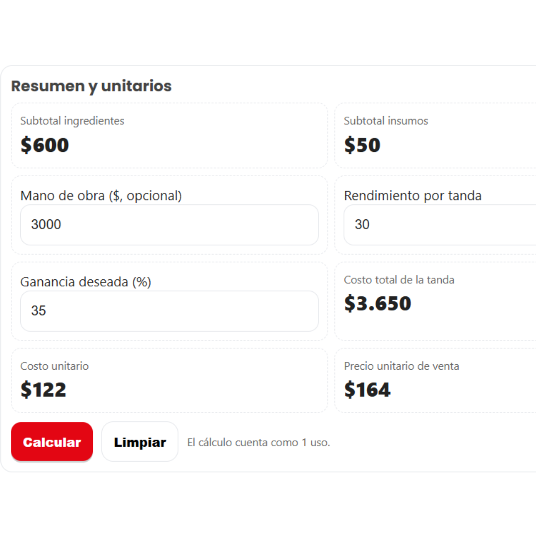 Cargás ingredientes, cantidades y costos. Obtenés costo por tanda, costo unitario, precio sugerido y un margen estimado para decidir con criterio.